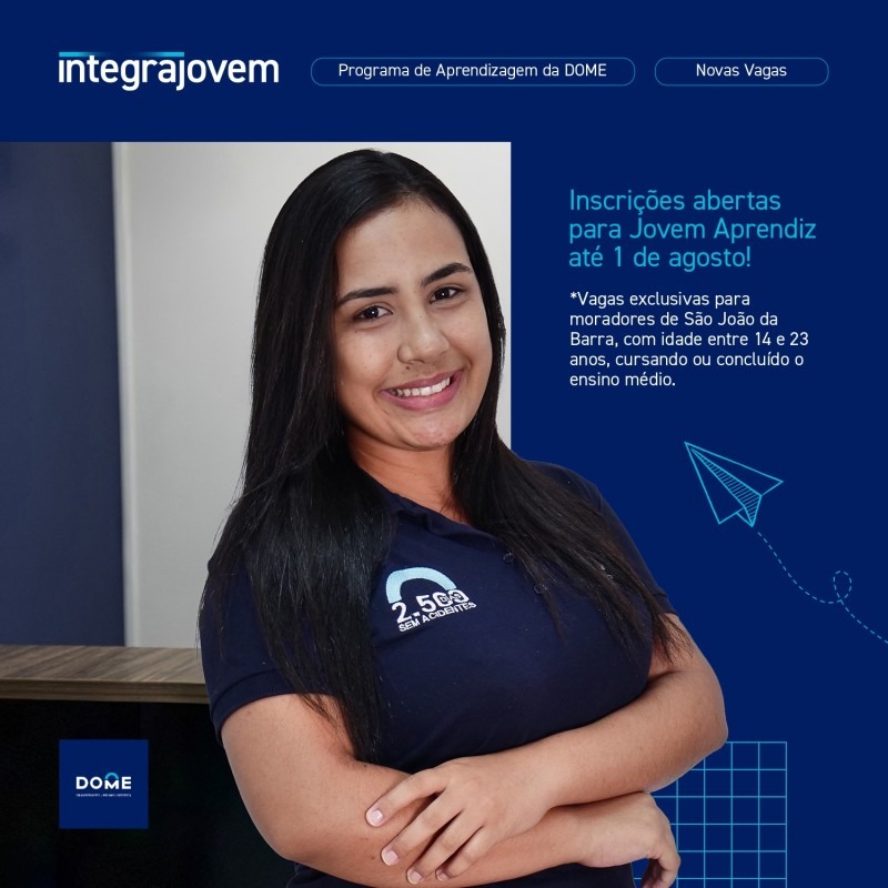 O Programa de Aprendizagem da Dome, empresa especializada em soluções logísticas para o setor de energia que atua no Porto do Açu, está com inscrições abertas até o dia 1º de agosto paara Jovem Aprendiz. O Integrajovem é voltado exclusivamente para jovens de São João da Barra, com idade entre 14 e 23 anos, cursando […]