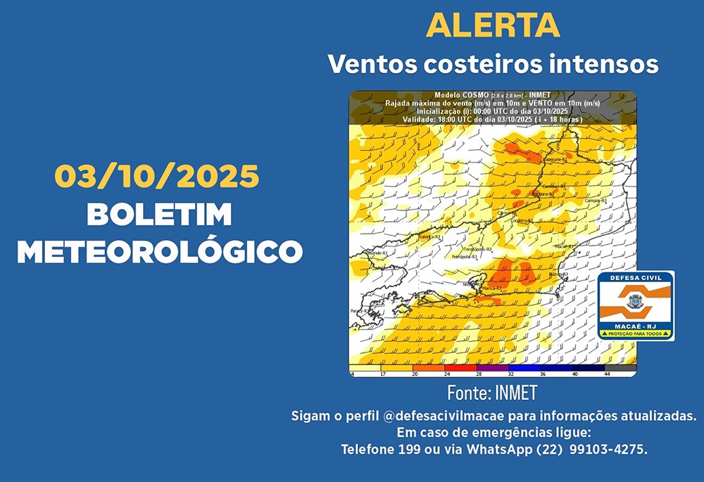 A Defesa Civil de Macaé divulgou um alerta meteorológico com previsão de ventos costeiros intensos que devem atingir o município entre esta sexta-feira (3) e domingo (5), conforme boletim emitido pelo Instituto Nacional de Meteorologia (Inmet). Diante das condições climáticas adversas, o órgão recomenda que a população evite circular em áreas abertas durante os períodos […]