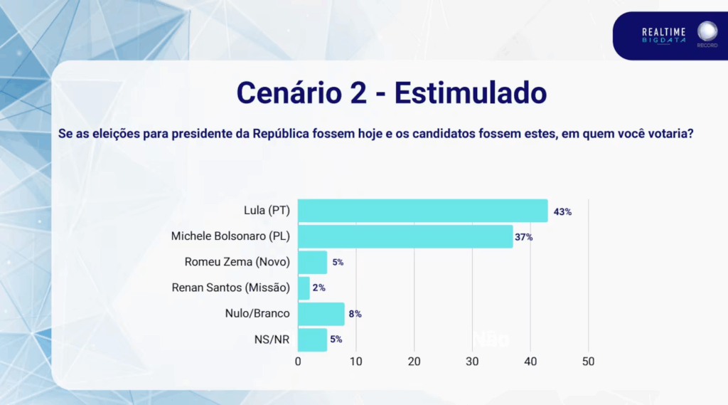 No segundo cenário, o levantamento também aponta competitividade de Michele Bolsonaro (PL). O petista marca 43%, contra 37% da ex-primeira-dama, diferença considerada próxima pelos analistas.
