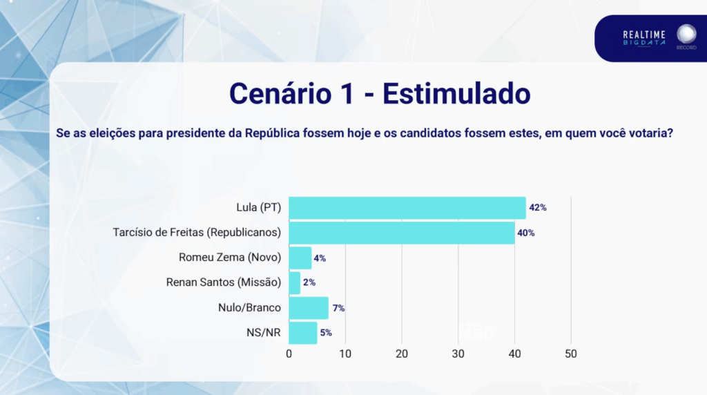 Segundo os dados estimulados (quando os nomes são apresentados aos eleitores), Lula teria 42% das intenções de voto contra 40% de Tarcísio. Como a diferença está na margem de erro de 2,2 pontos percentuais, os dois aparecem tecnicamente empatados.
