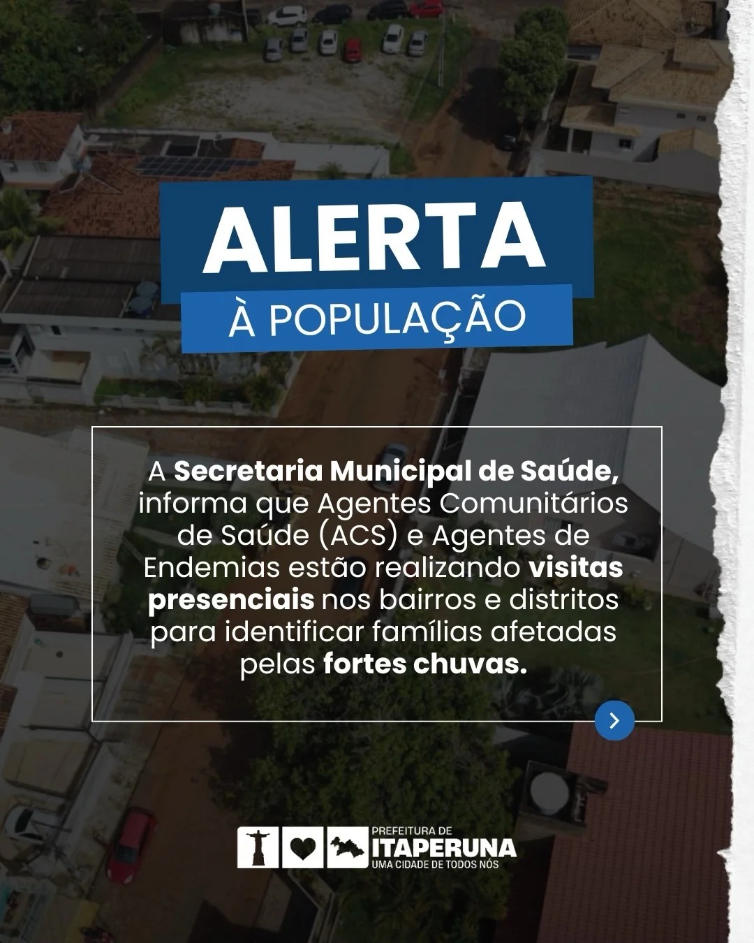 A Secretaria Municipal de Saúde, informa que Agentes Comunitários de Saúde (ACS) e Agentes de Endemias estão realizando visitas presenciais nos bairros e distritos para identificar famílias afetadas pelas fortes chuvas.