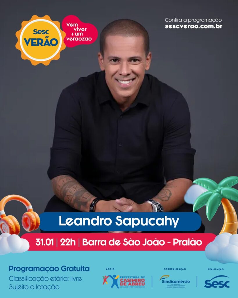 A agenda cultural também ganha destaque com o show do cantor Leandro Sapucahy, marcado para sábado (31), às 22h, no Praião, em Barra de São João. Já no domingo (1º), a programação segue com a Clínica de Skate, às 10h, com Ítalo Penarrubia, e a Clínica de Futevôlei, às 15h, com Rafaella Fontes, ambas na Prainha.